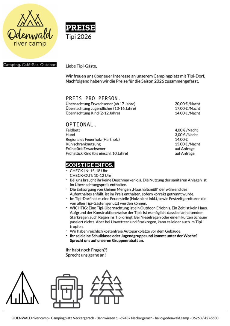 WICHTIG: Eine Tipi-Übernachtung ist ein Outdoor-Erlebnis. Ein Zelt ist kein Haus. Aufgrund der Konstruktionsweise der Tipis ist es möglich, dass bei anhaltendem Starkregen und Unwettern auch Regen ins Tipi dringt.